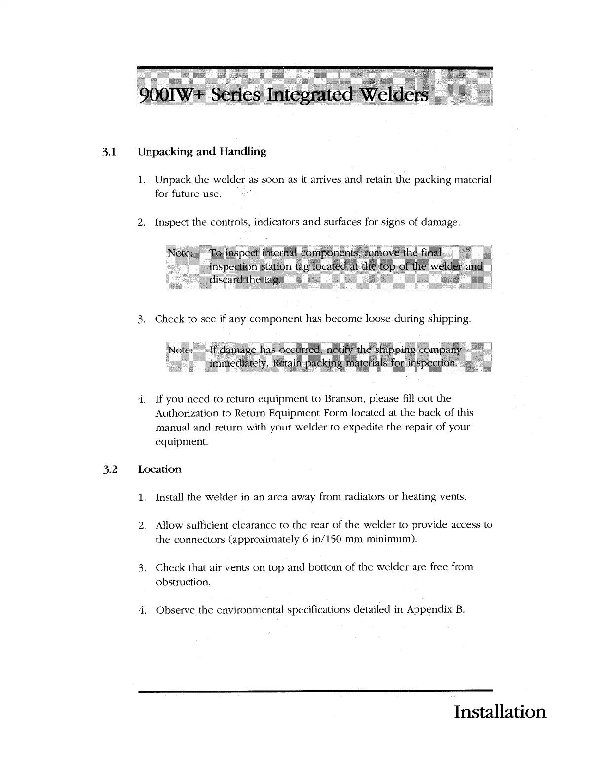 Unpack the welder as soon as it arrives and retain the packing material