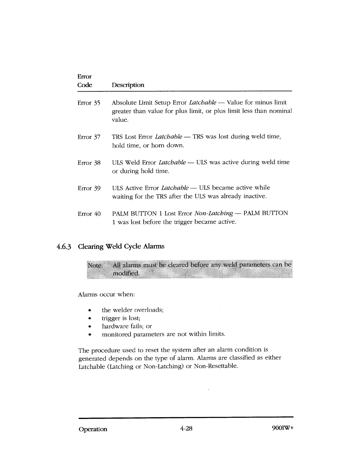 Note: All alarms must be cleared before any weld parameters can be