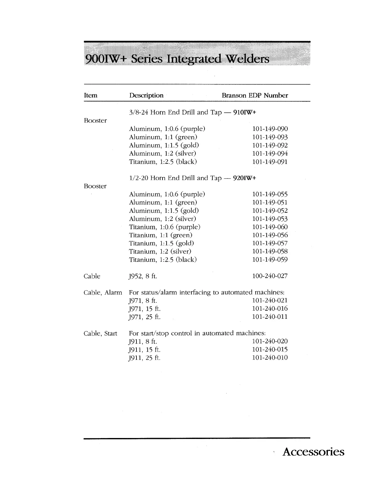 Branson 900IW+ Series - Accessories; Available Boosters, Cables, and Hubs