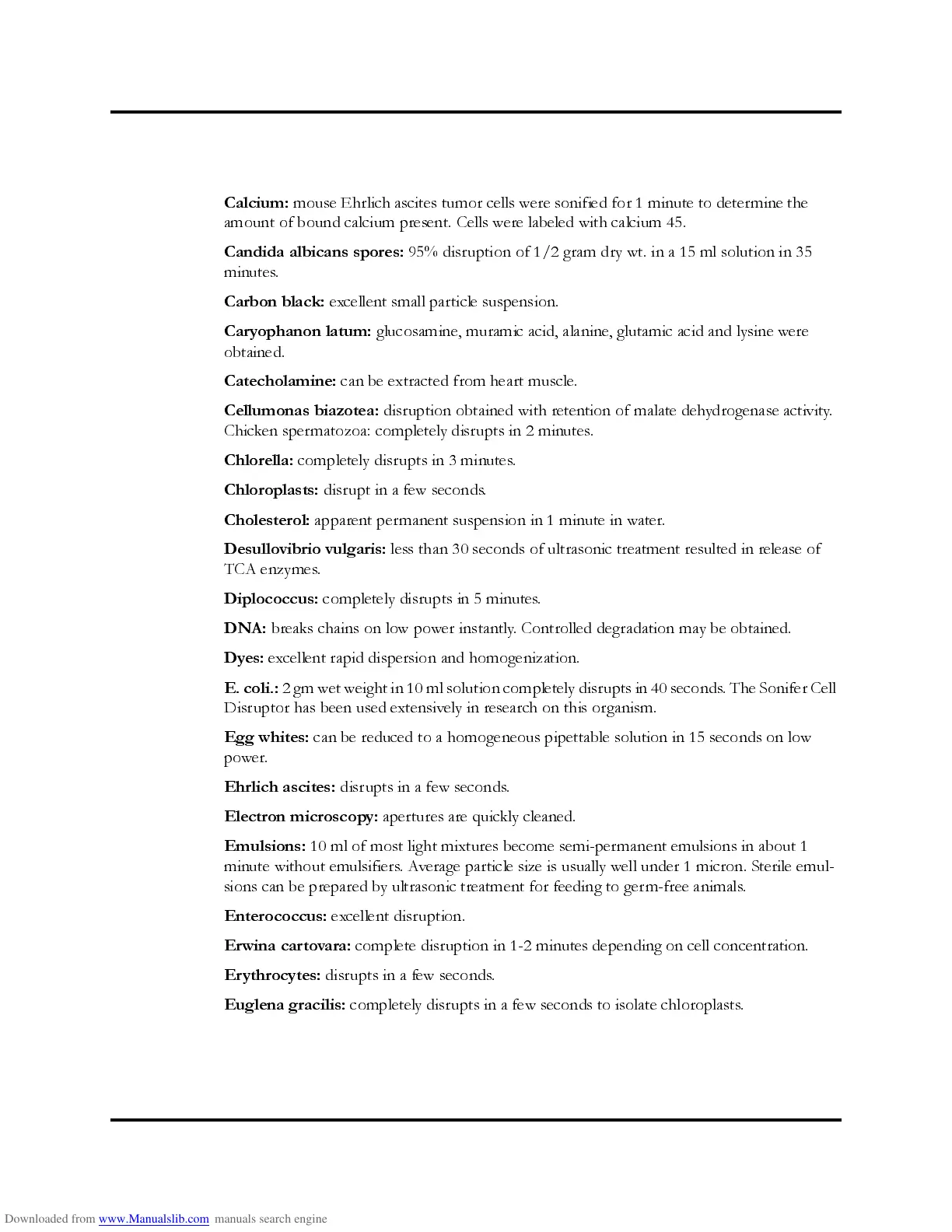 2 gm wet weight in 10 ml solution completely disrupts in 40 seconds. The Sonifer Cell