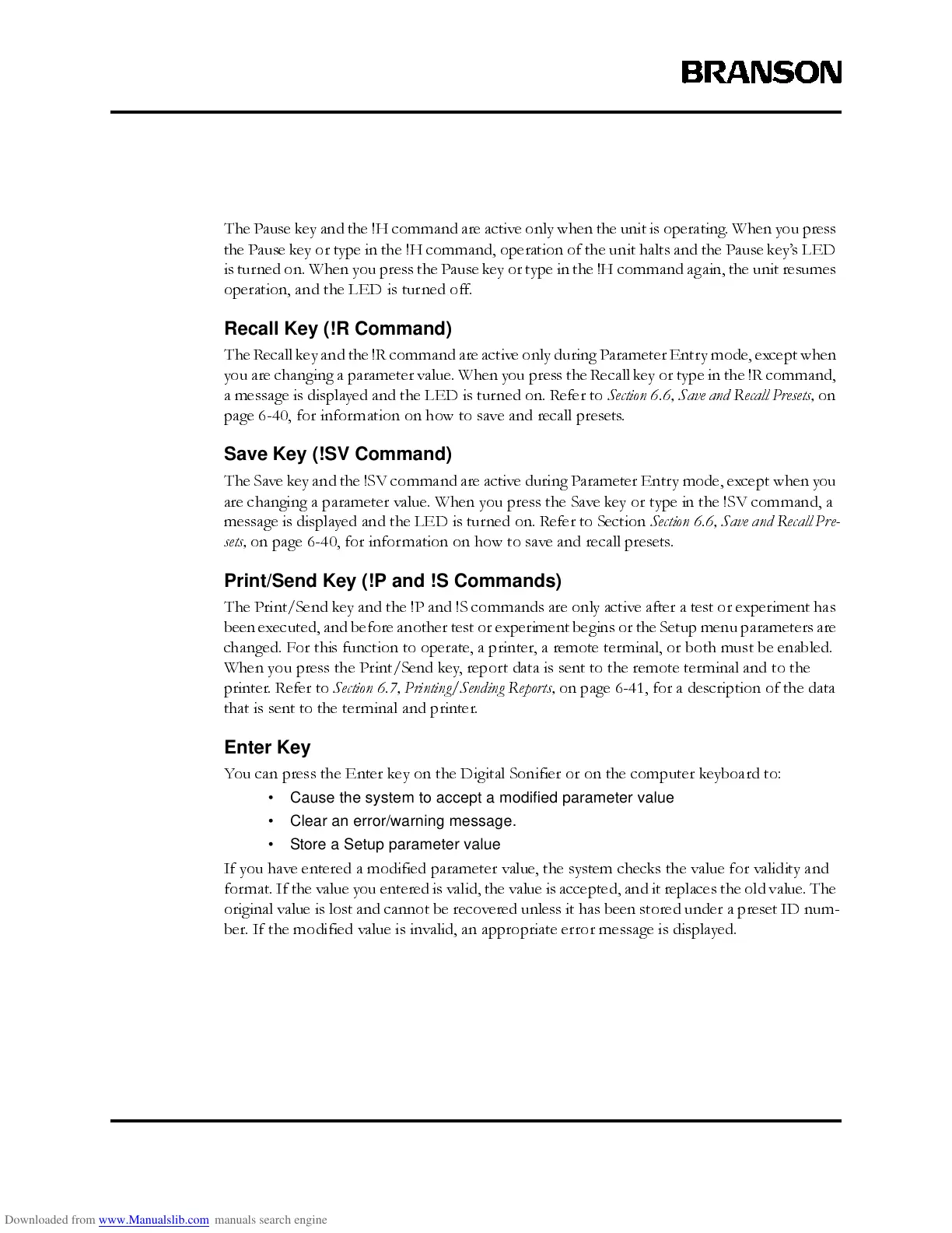 The Recall key and the !R command are active only during Parameter Entry mode, except when
