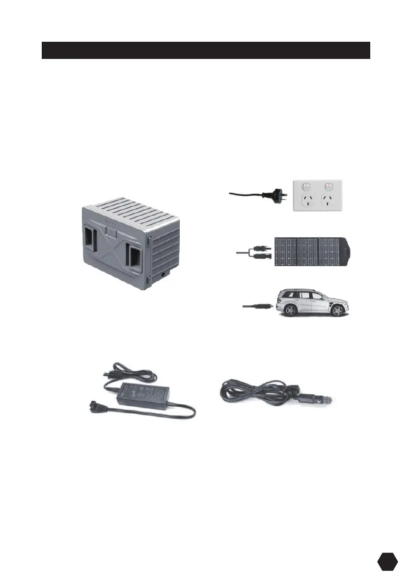 • DC/ AC power will run the refrigerator, and charge the optional removable battery