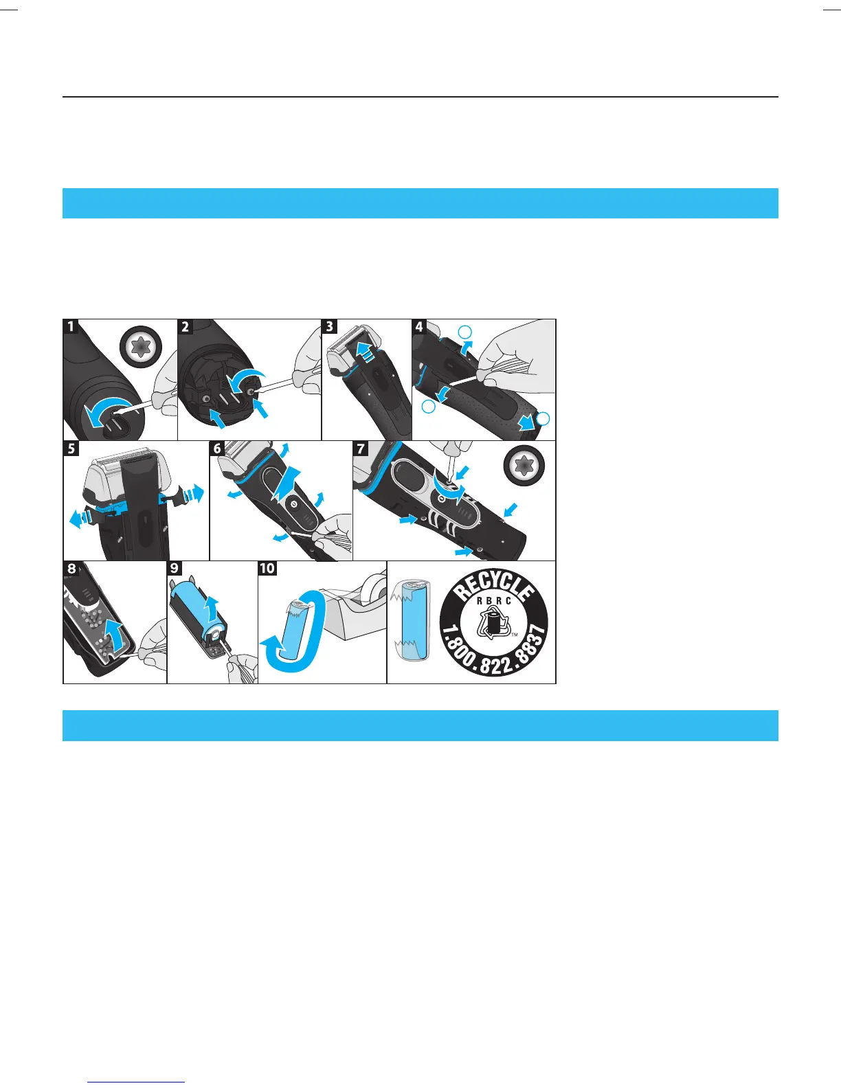 disassemble the housing as shown, remove the rechargeable battery and recycle or