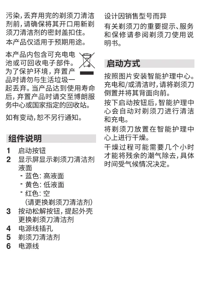 Braun 5434 - 组件说明; 1 启动按钮; 2 显示屏显示剃须刀清洁剂液面; 3 按动松解按钮,提起外壳更换剃须刀清洁剂