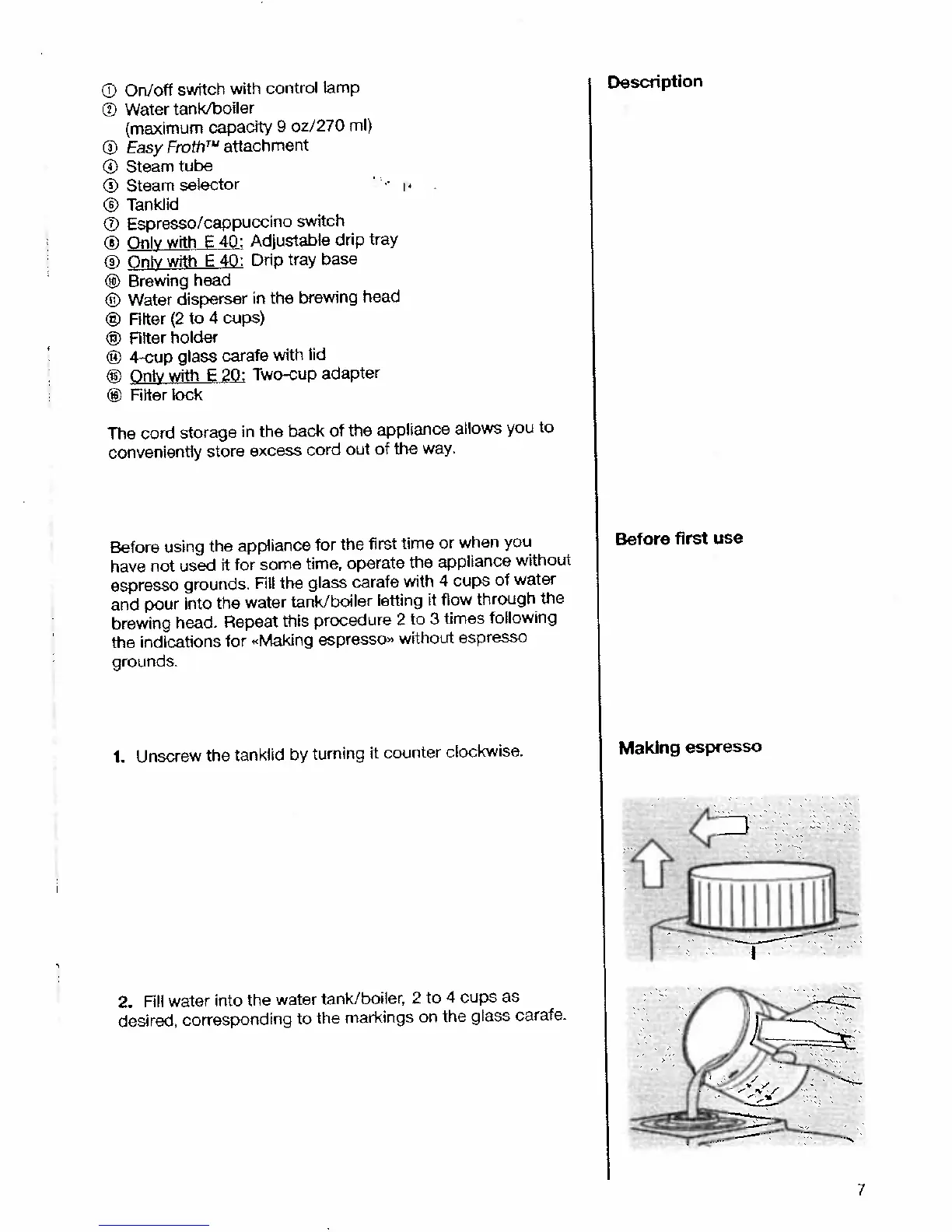 Braun EspressoCappucino E20 - Appliance Preparation and Operation; Before First Use; Making Espresso