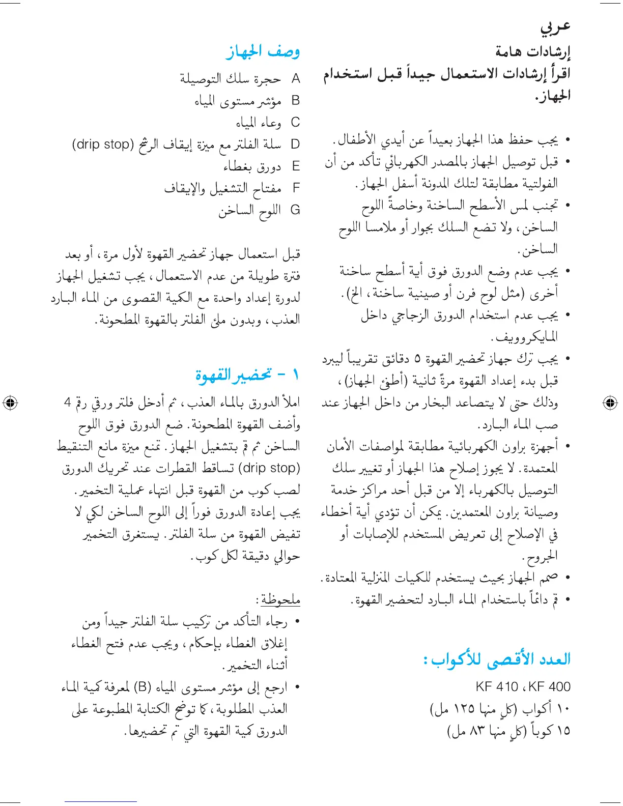 Braun KF400 Aromaster Plus - Arabic Usage Guide; Important Instructions; Coffee Preparation