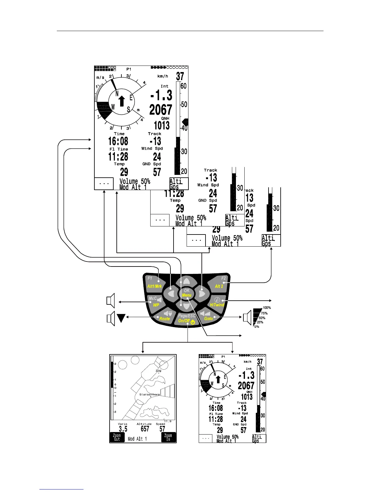 Brauniger IQ-Compeo+ - Display indications defined by user; Soft-key F1 and F2 functions; Switching Instrument screen; Map Mode