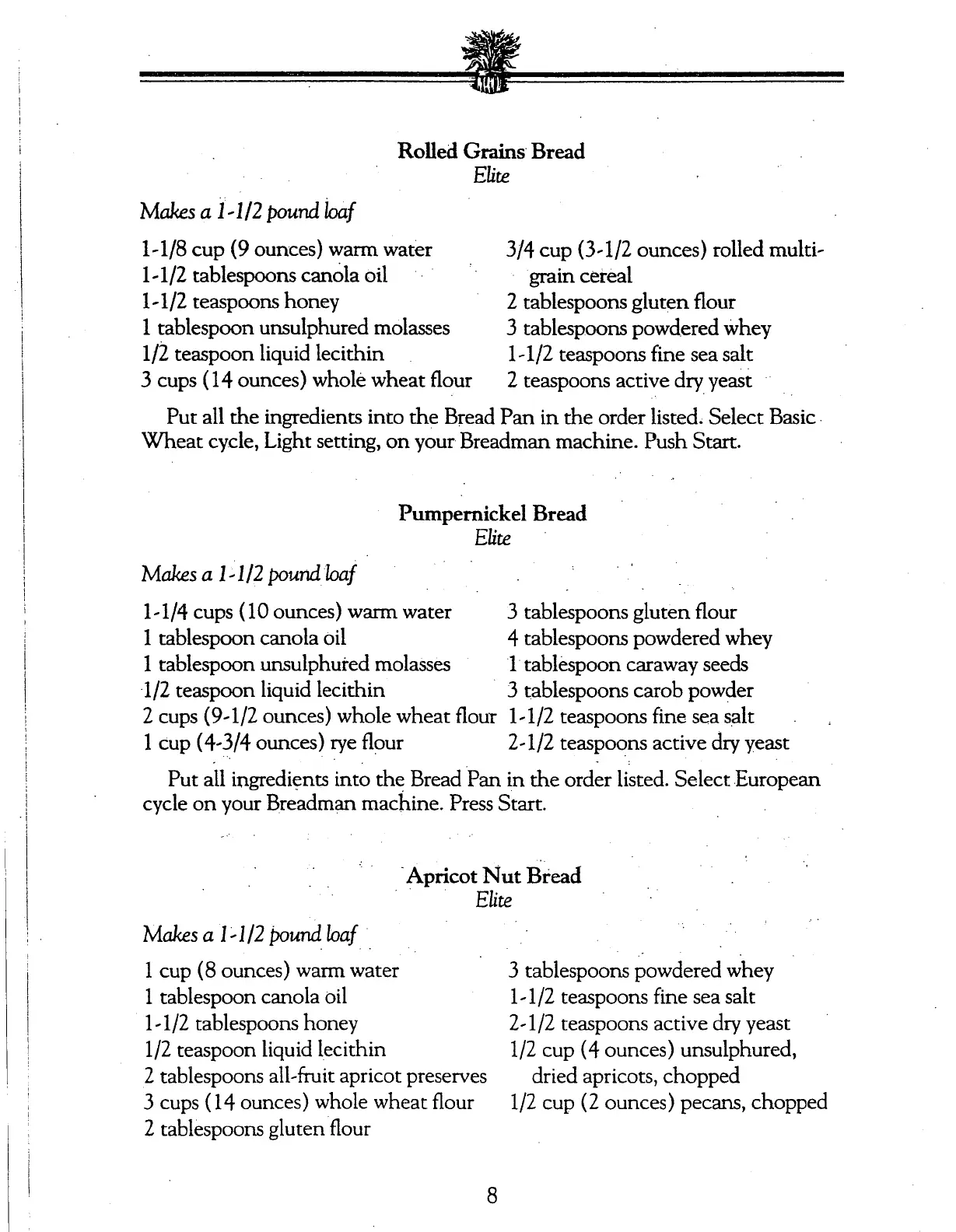 Breadman Plus TR845 - Elite Recipes: Rolled Grains, Pumpernickel, and Apricot Nut Breads
