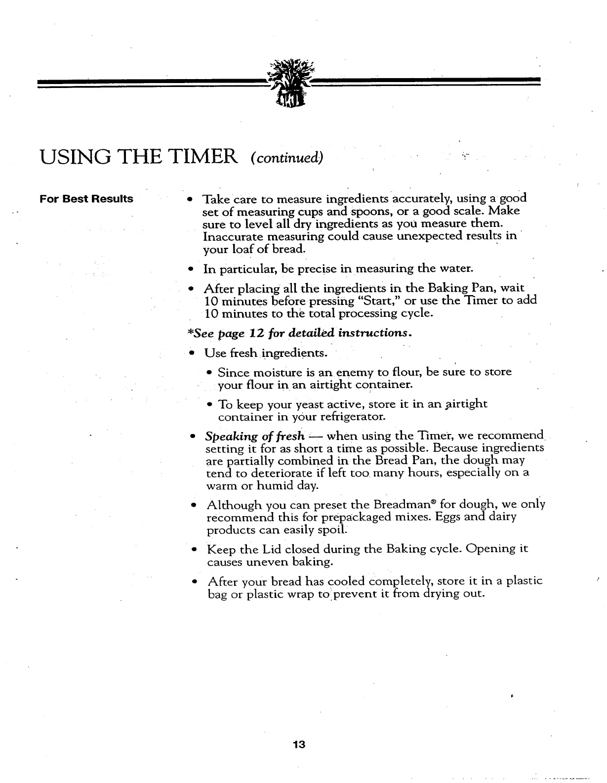 Breadman TR441 - Timer Function Best Results; Tips for Best Timer Results