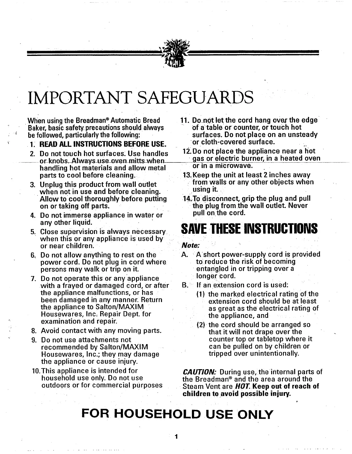 Breadman TR441 - Important Safeguards