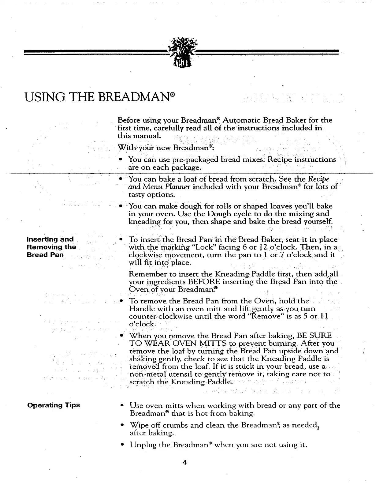 Breadman TR441 - Using the Breadman Appliance; Bread Pan Handling; Operating Tips and Precautions