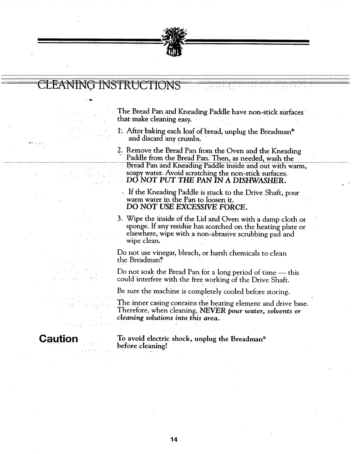 Breadman TR442 - Cleaning and Maintenance; Cleaning Safety Warning