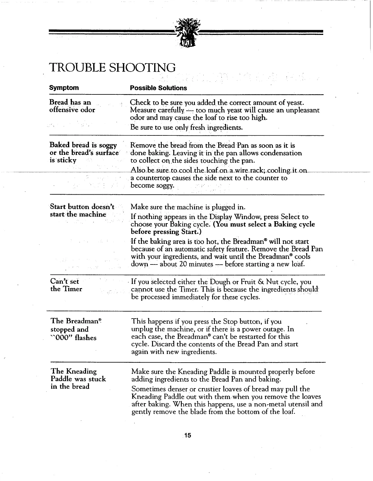 Breadman TR500A - TROUBLESHOOTING: Common Issues