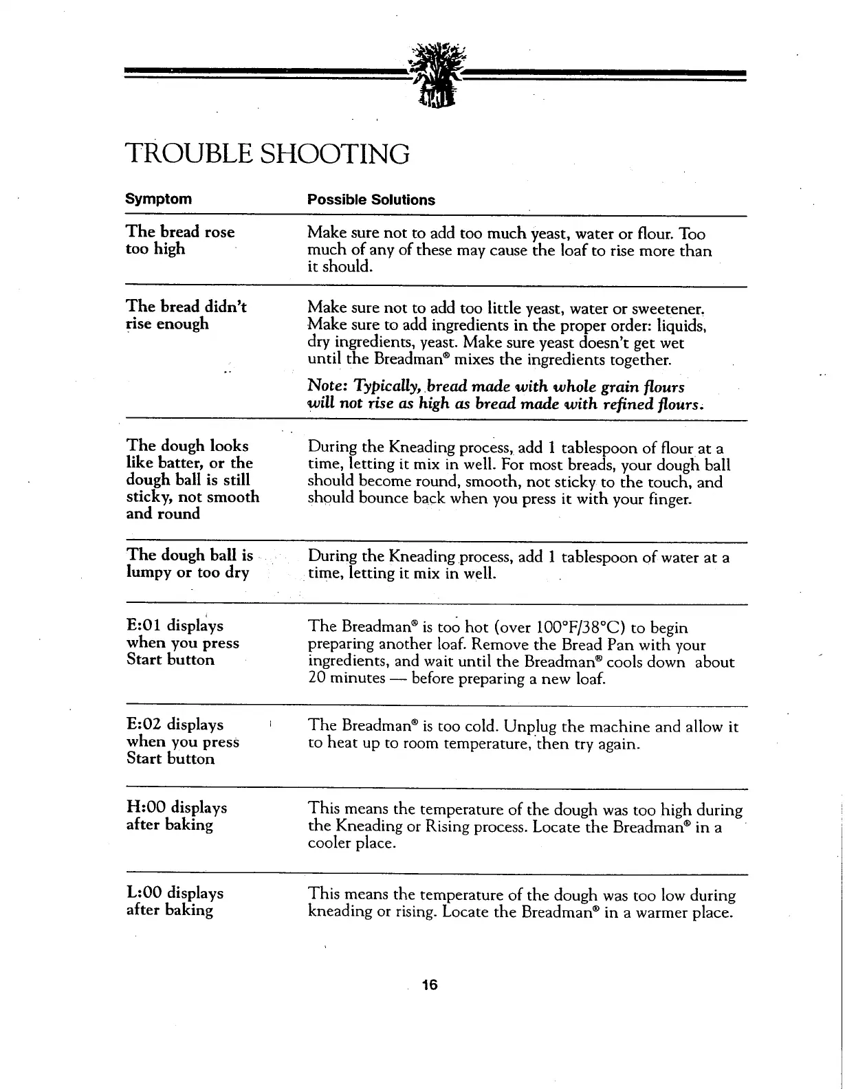 Breadman TR500A - TROUBLESHOOTING: Error Codes and Dough