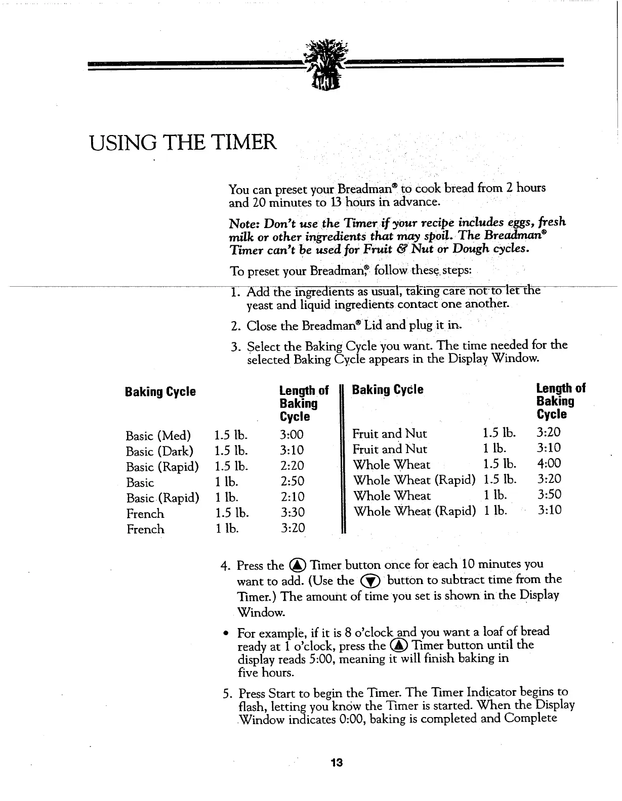 Breadman TR510 - Using the Timer; Presetting the Timer