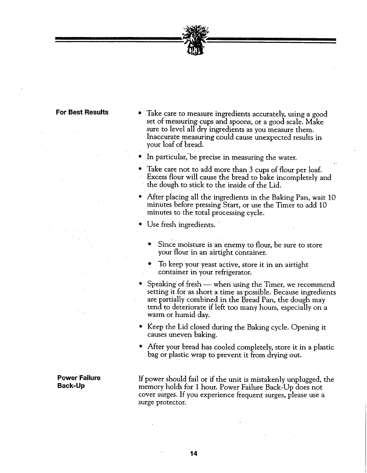 Breadman TR510 - Tips for Best Results; Power Failure Back-Up