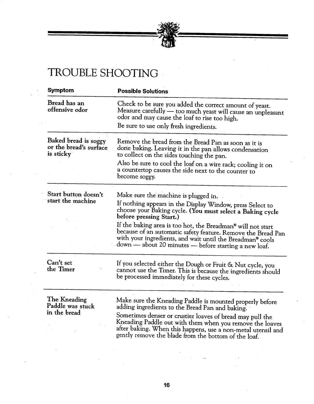 Breadman TR510 - Troubleshooting Common Issues; Symptom and Solution Pairs