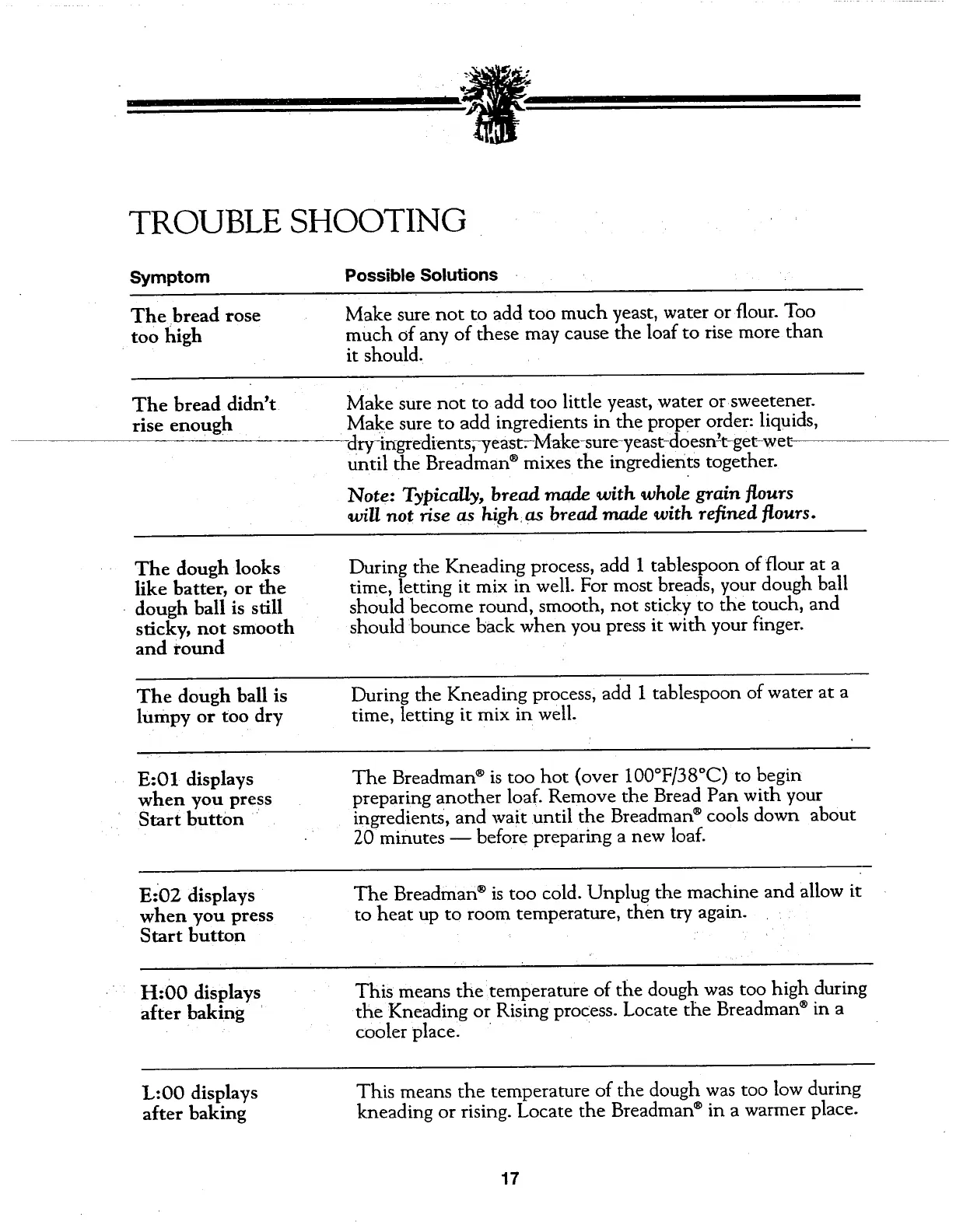 Breadman TR510 - Troubleshooting Common Issues (Continued); Error Codes and Dough Issues