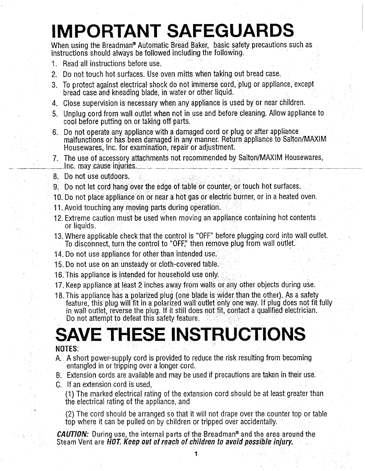 Breadman TR510 - Important Safeguards