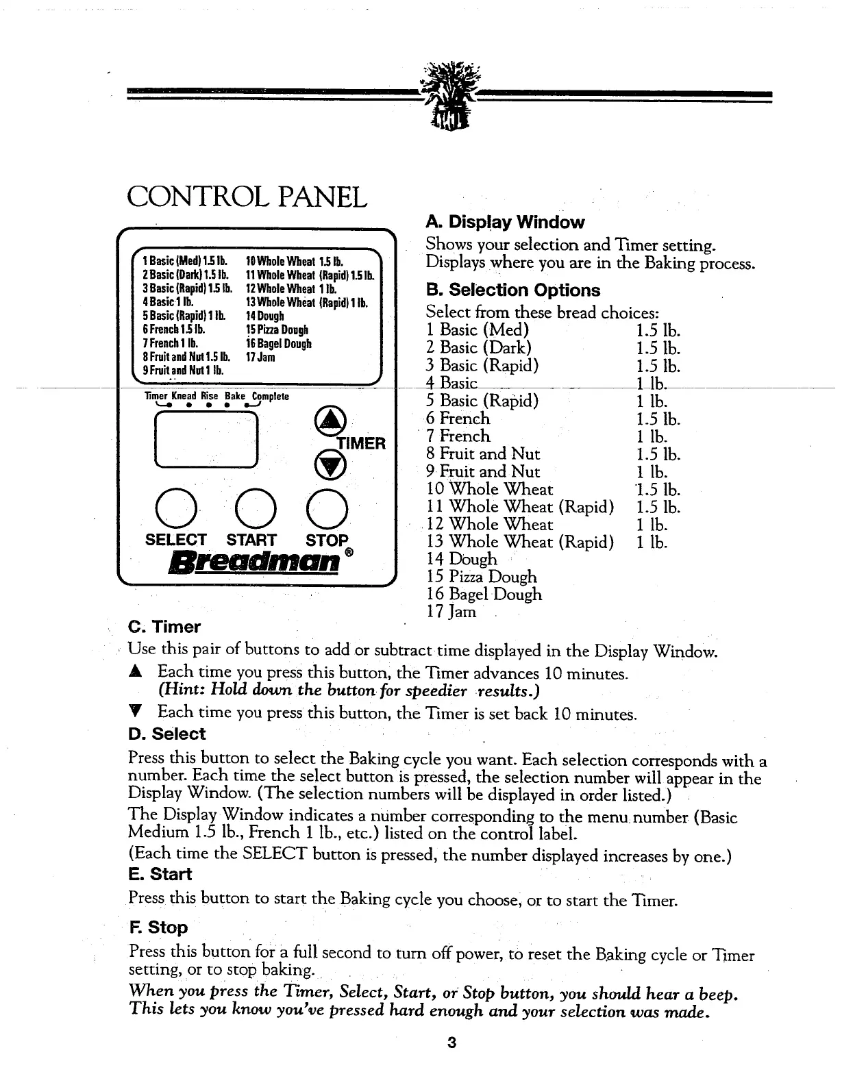 Breadman TR510 - Control Panel Overview; Display Window; Selection Options; Timer and Control Buttons