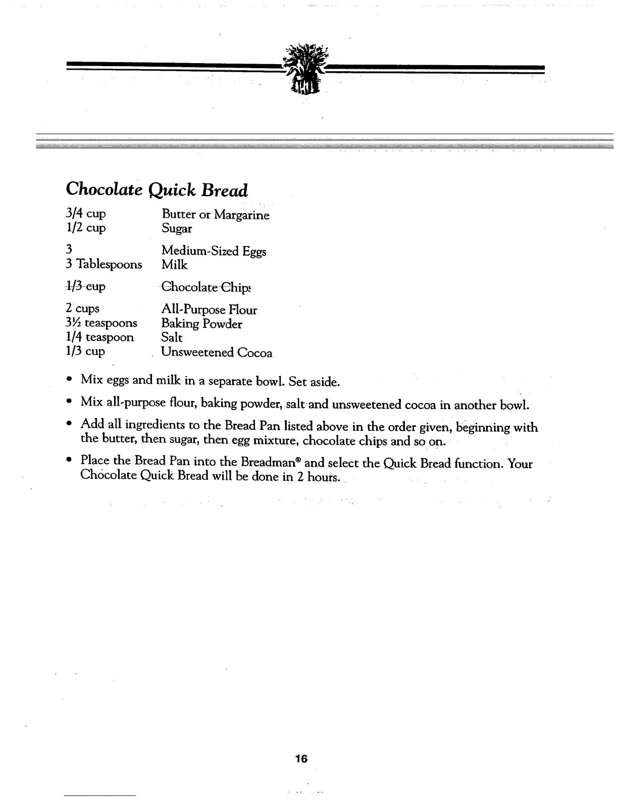 Place the Bread Pan into the Breadman ®and select the Quick Bread function. Your