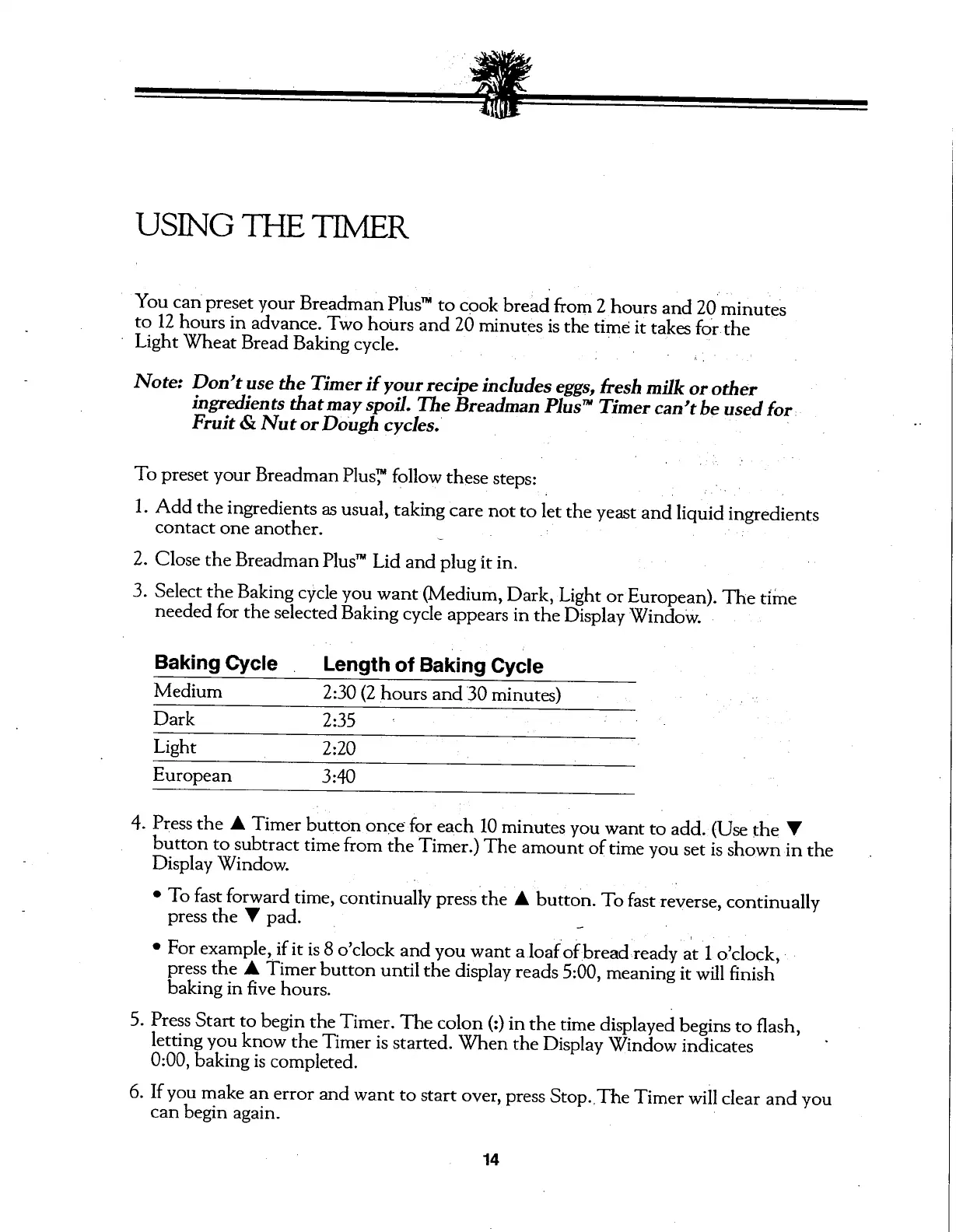Breadman TR600 - Using the Timer; Baking Cycles Table