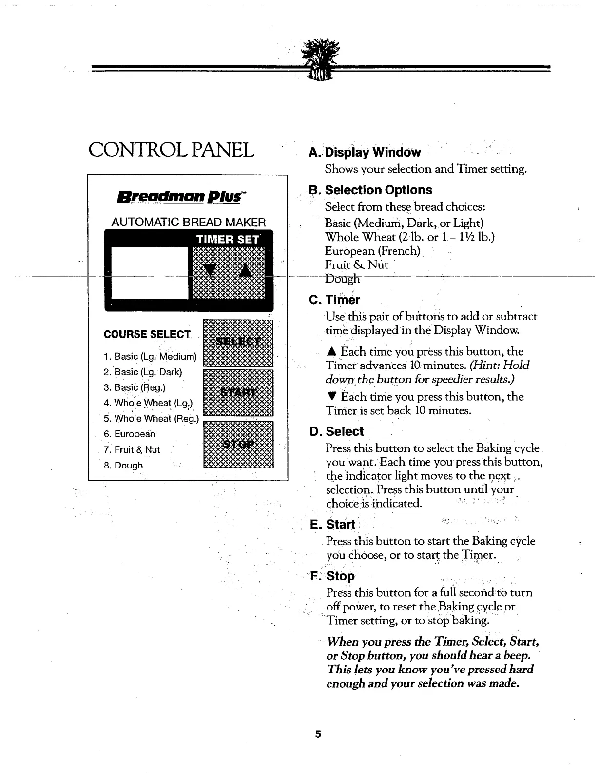 Breadman TR600 - Control Panel