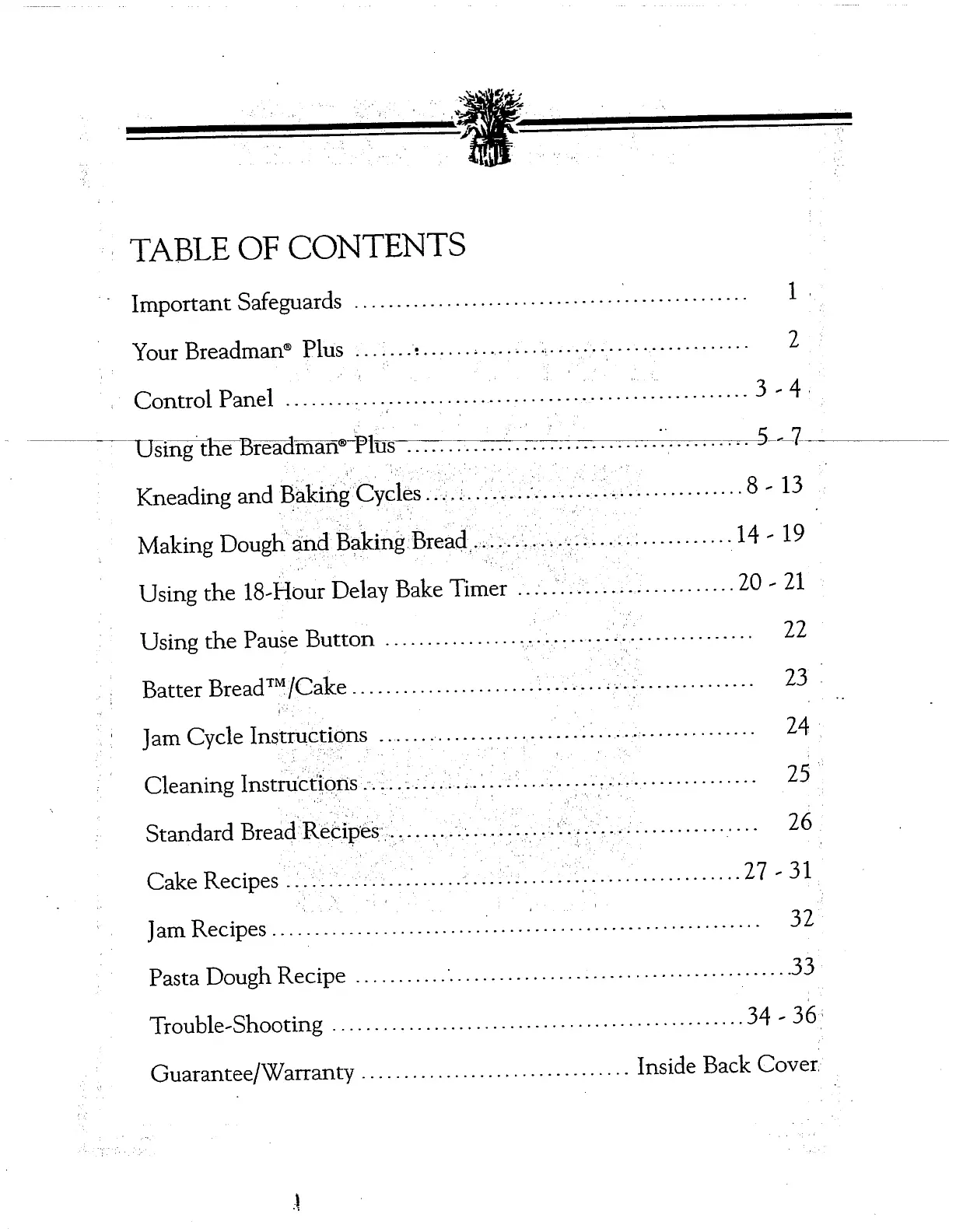 Breadman TR700C - Table of Contents