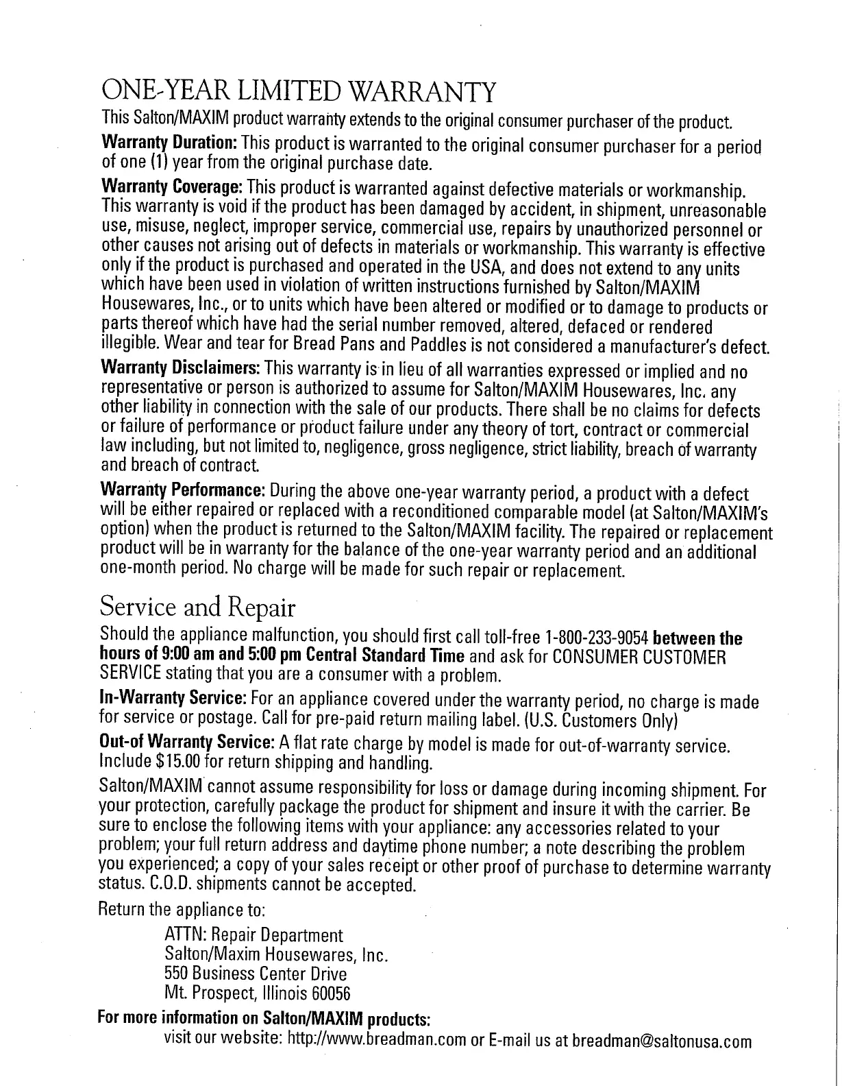 Breadman TR700C - One-Year Limited Warranty