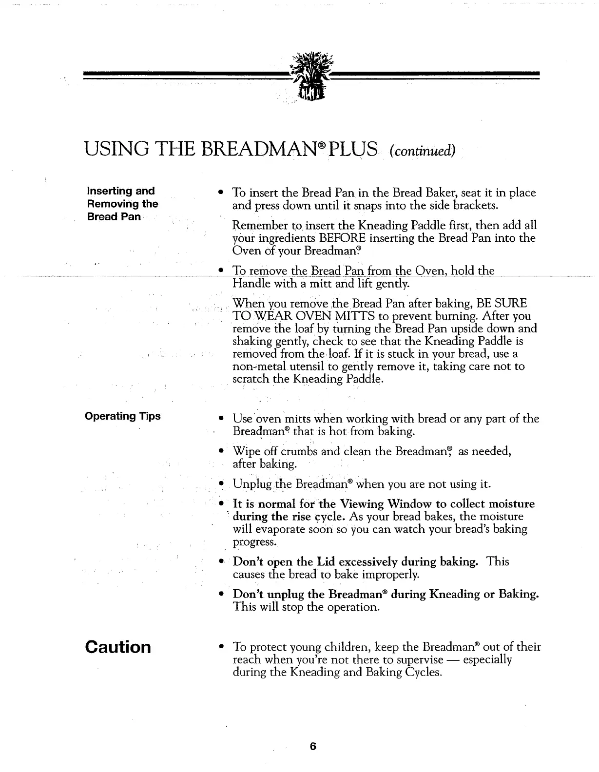 Breadman TR700C - Using; Inserting and Removing the Bread Pan; Operating Tips