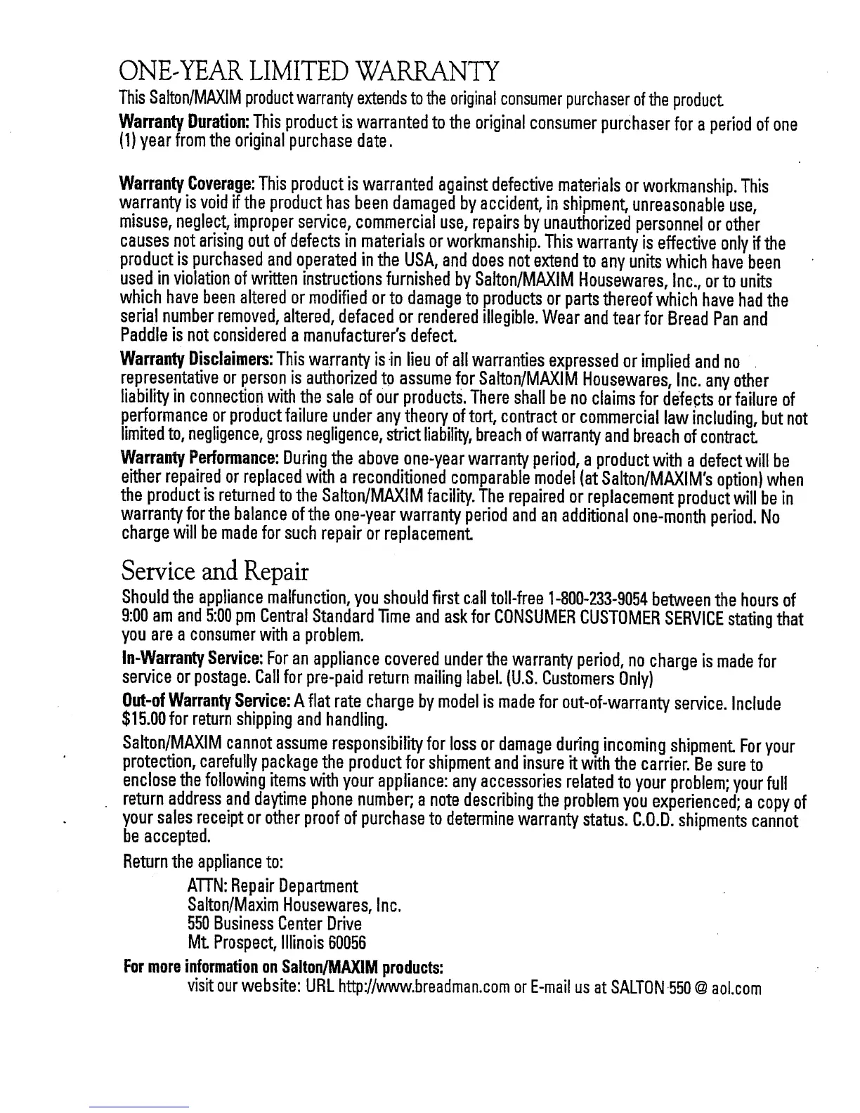 visit ourwebsite: URL http://www.breadman.comor E-mailusat SALTON550@aol.com