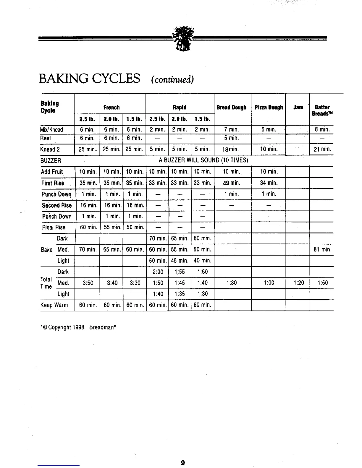 Breadman TR810 - French and Rapid Cycle Timings; Bread Dough and Pizza Dough Timings; Jam and Batter Breads Timings