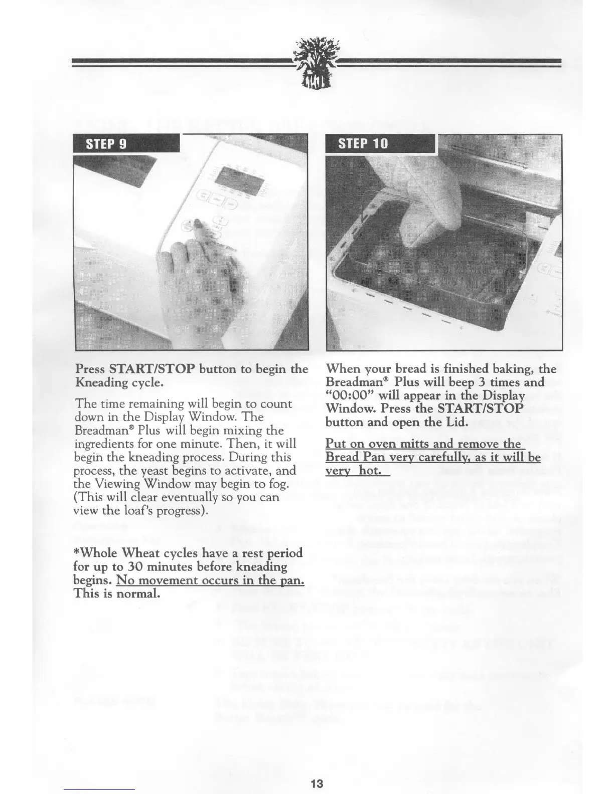 Breadman TR810 - Step 9: Start Kneading Cycle; Step 10: Remove Baked Bread