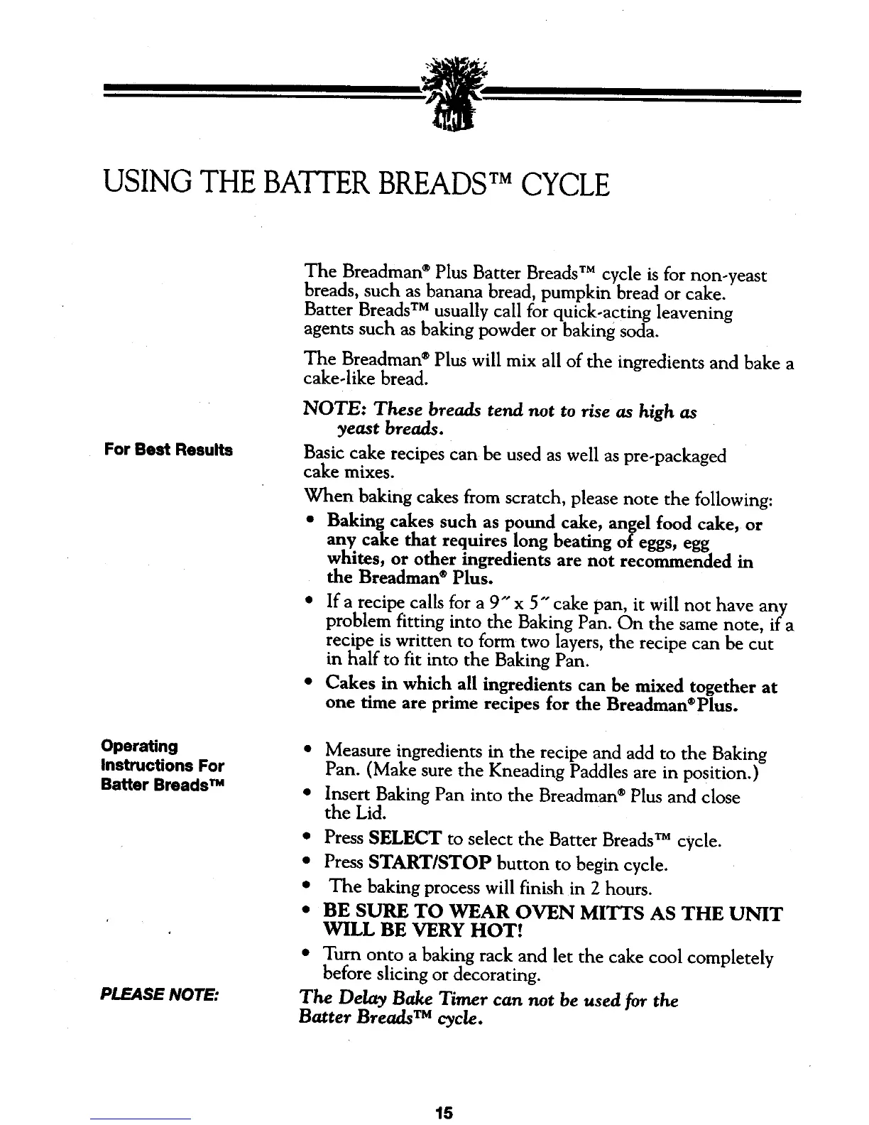 Breadman TR810 - Using the Batter Breads Cycle; Best Results for Batter Breads; Operating Instructions for Batter Breads; Important Notes for Batter Breads