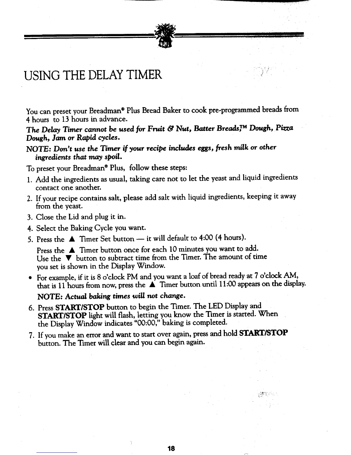 Breadman TR810 - Using the Delay Timer; Delay Timer Limitations and Cycles; Presetting the Delay Timer for Bread; Starting and Resetting the Timer