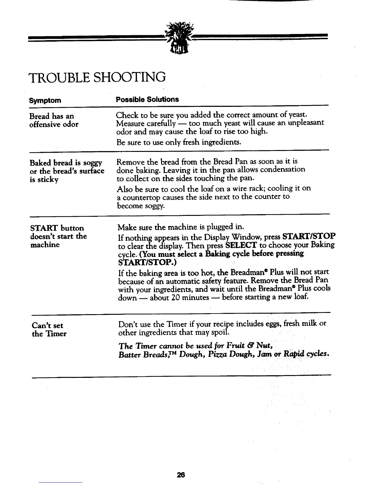 Breadman TR810 - Trouble Shooting Guide; Bread Odor and Surface Issues; Machine Start and Timer Problems