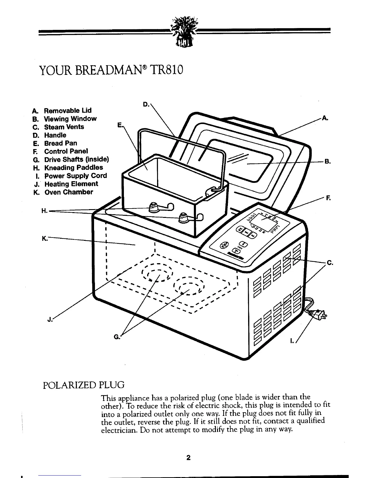 Breadman TR810 - Breadman TR810 Appliance Components; Appliance Parts Identification; Polarized Plug Safety Information