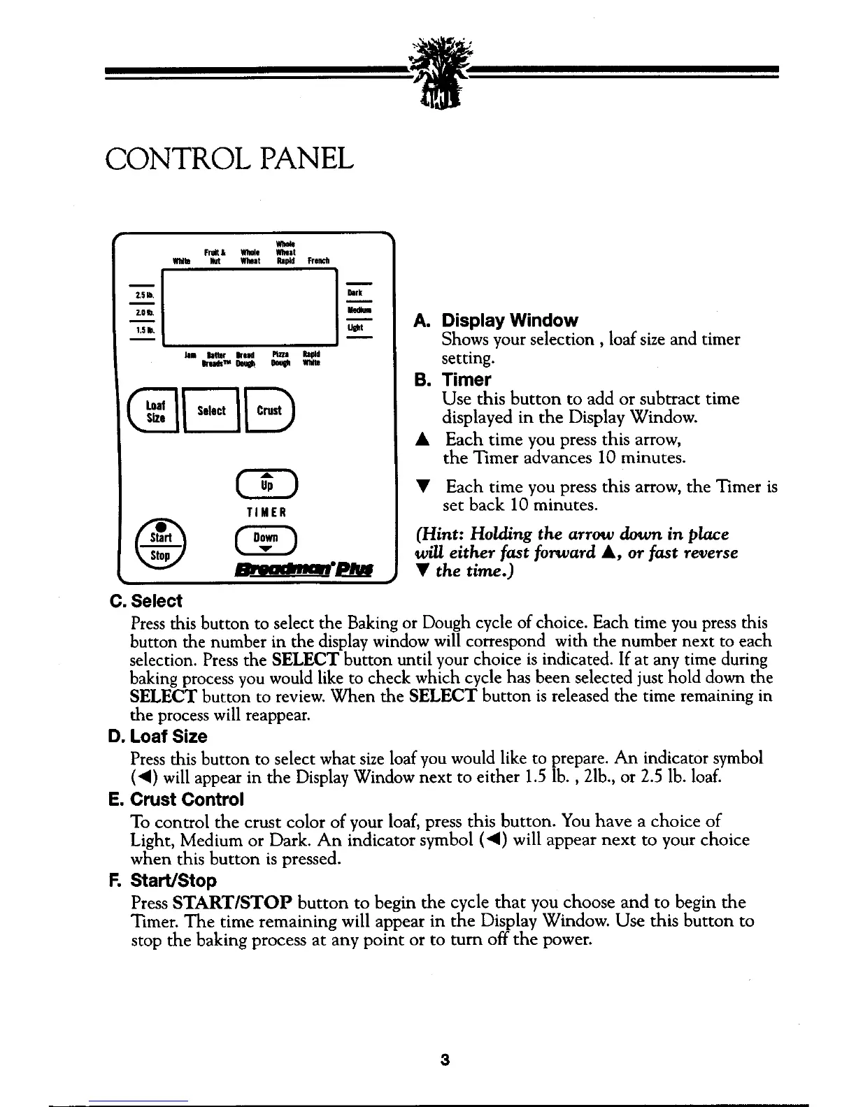 Breadman TR810 - Control Panel Operation; Control Panel Buttons and Display Guide