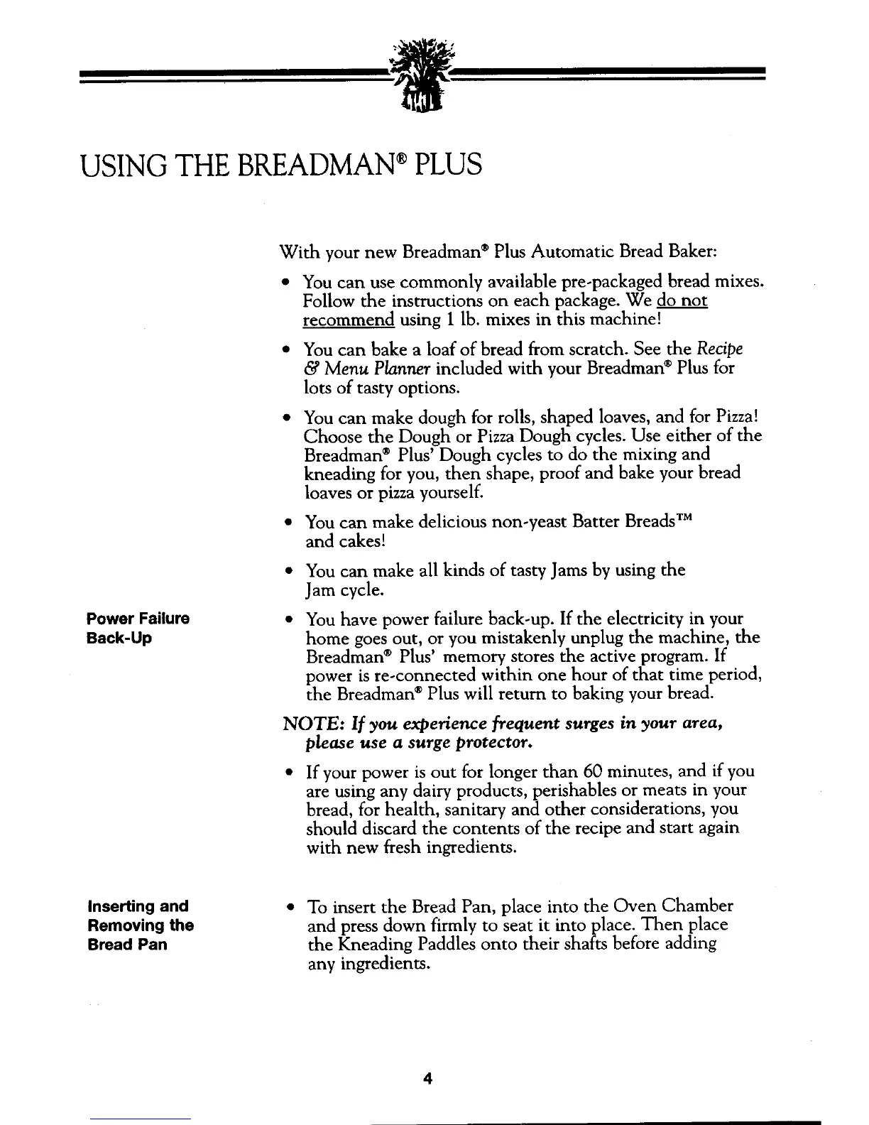 Breadman TR810 - Using the Breadman Plus; Bread Mixes and Scratch Baking; Dough, Pizza, and Jam Cycles; Power Failure Back-Up Feature