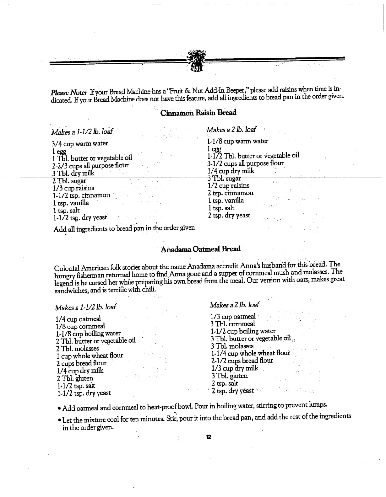 Breadman Ultra TR-700 - Cinnamon Raisin Bread; Anadama Oatmeal Bread