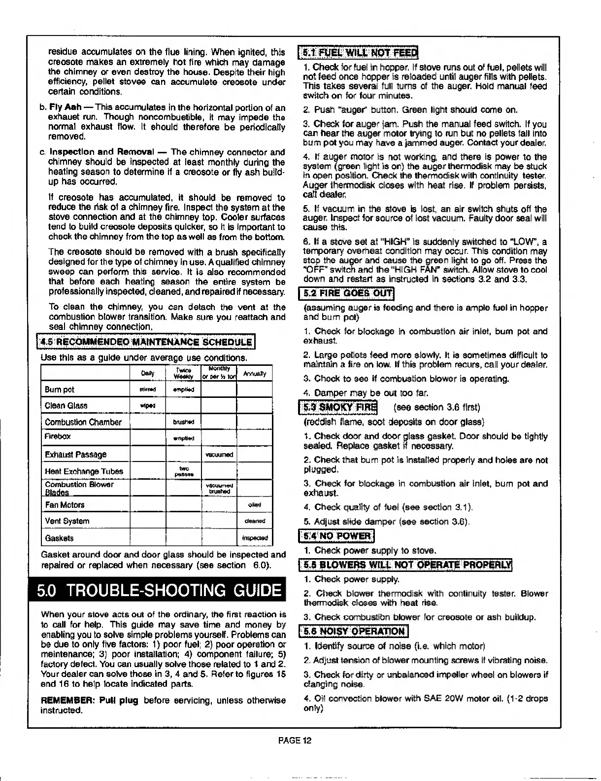 Breckwell P23FS - Recommended Maintenance Schedule; Trouble-Shooting Guide; Fuel Will Not Feed; Fire Goes Out