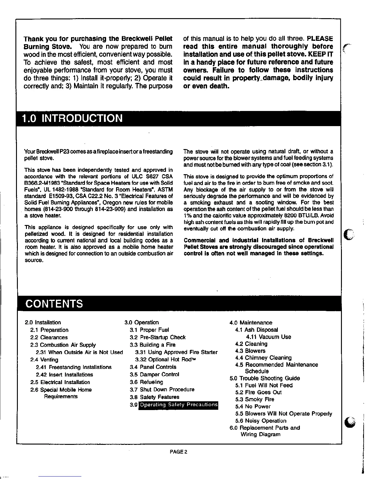 Breckwell P23I - 1.0 INTRODUCTION; 2.0 INSTALLATION; 3.0 OPERATION; 4.0 MAINTENANCE