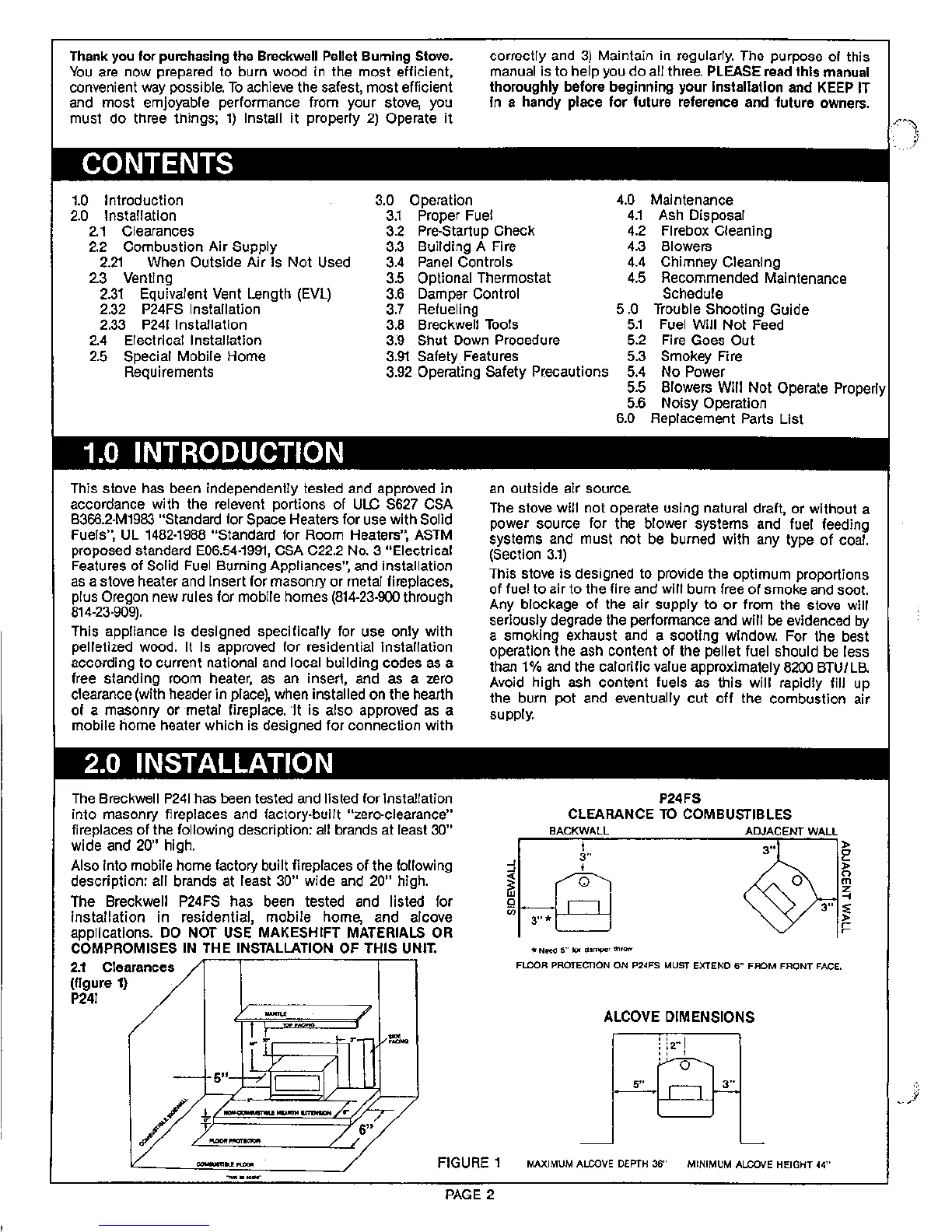 Breckwell P241 - 1.0 Introduction; 2.0 Installation; 2.1 Clearances; 2.2 Combustion Air Supply