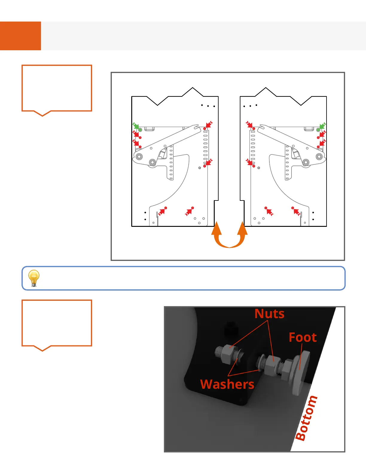 Red locations indicate a 30mm bolt and nylock nut. The green locations will