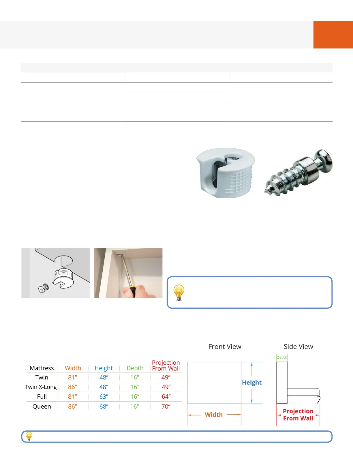 Use the dimensions below to clear a wall area where the bed be attached. The