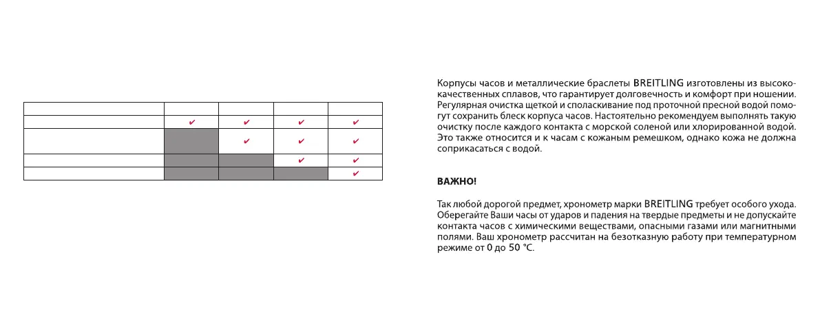 и кнопки под водой и когда часы мокрые. Ниже приводится таблица, которая