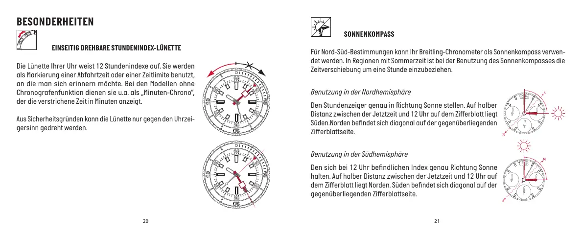 Für Nord-Süd-Bestimmungen kann Ihr Breitling-Chronometer als Sonnenkompass verwen-