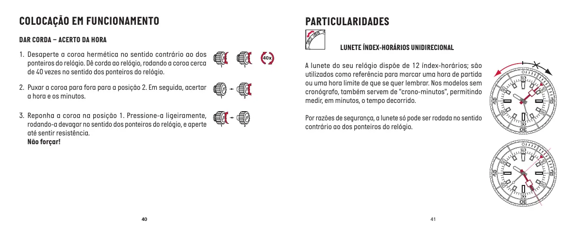 ponteiros do relógio. Dê corda ao relógio, rodando a coroa cerca