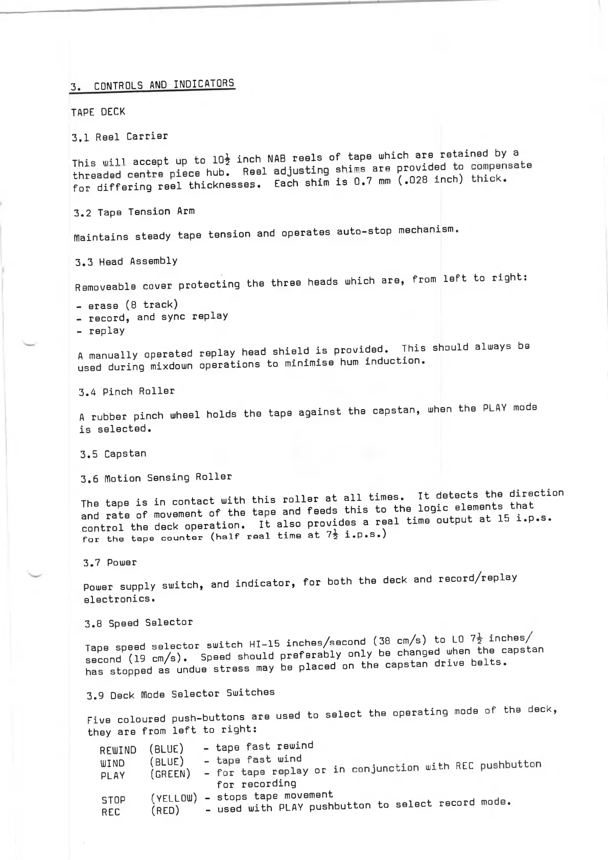 Brenell MINI 8 - Controls and Indicators; Reel Carrier; Tape Tension Arm; Head Assembly