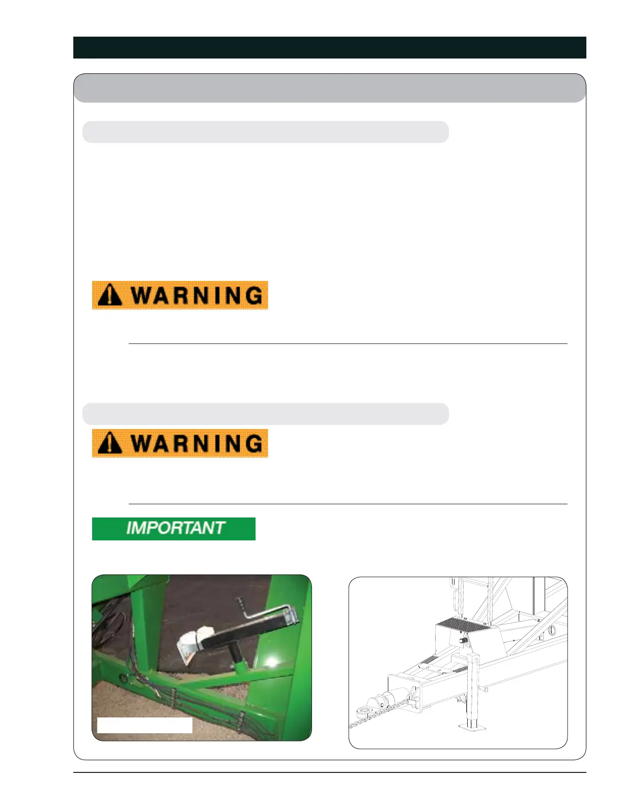 This cart is intended to be hitched to a tractor drawbar. Do not attempt to hitch to any other location